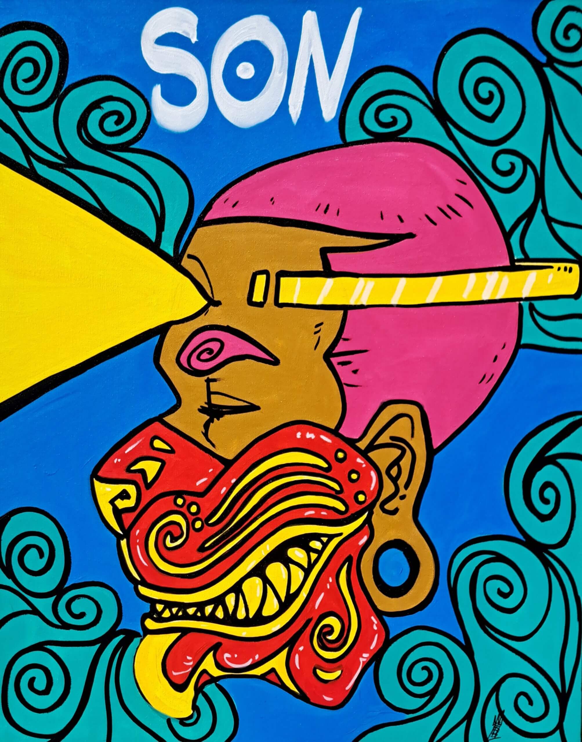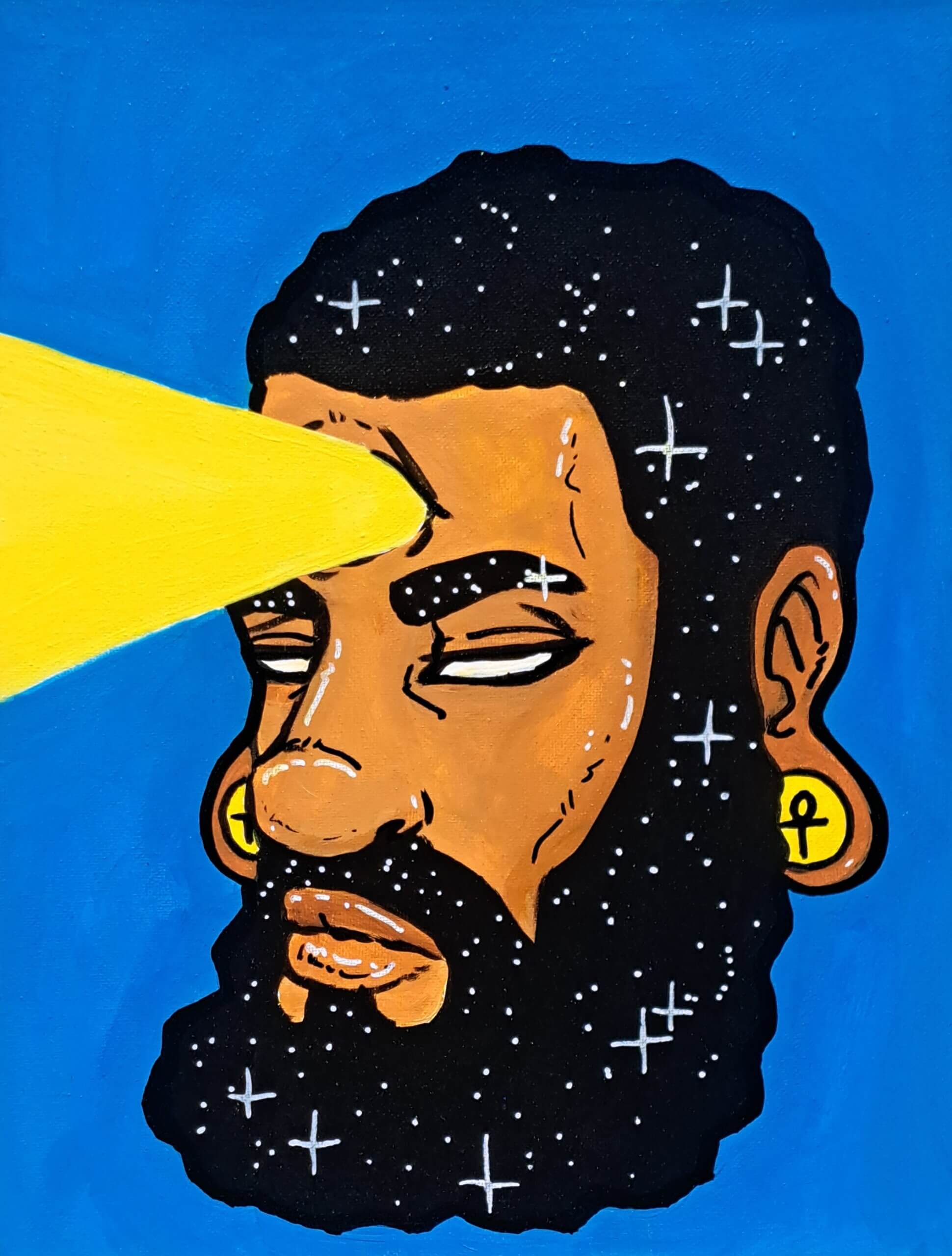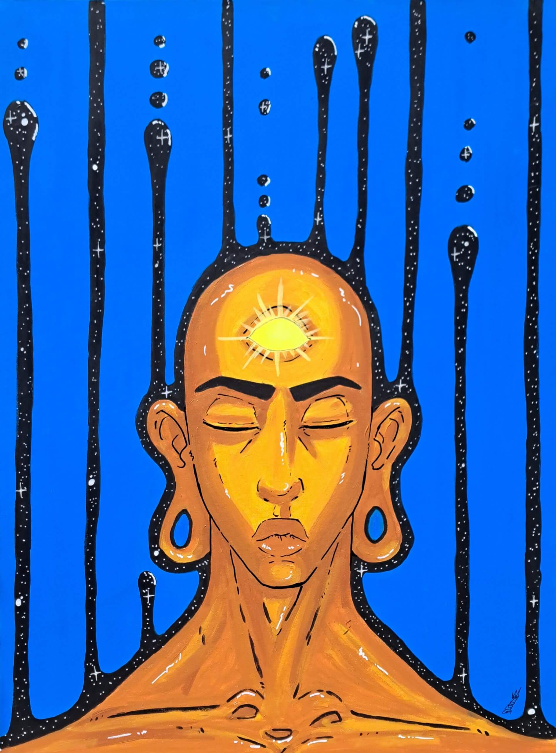 A dark-hued figure commands the canvas, cosmic in setting, luminous in presence with light radiating from the third eye. The colors are vivid, the symbolism layered. You start to notice what you’re actually looking at. And then, if you’re paying attention, Hodge will tell you what he sees from across the room: the moment your mind turns on.