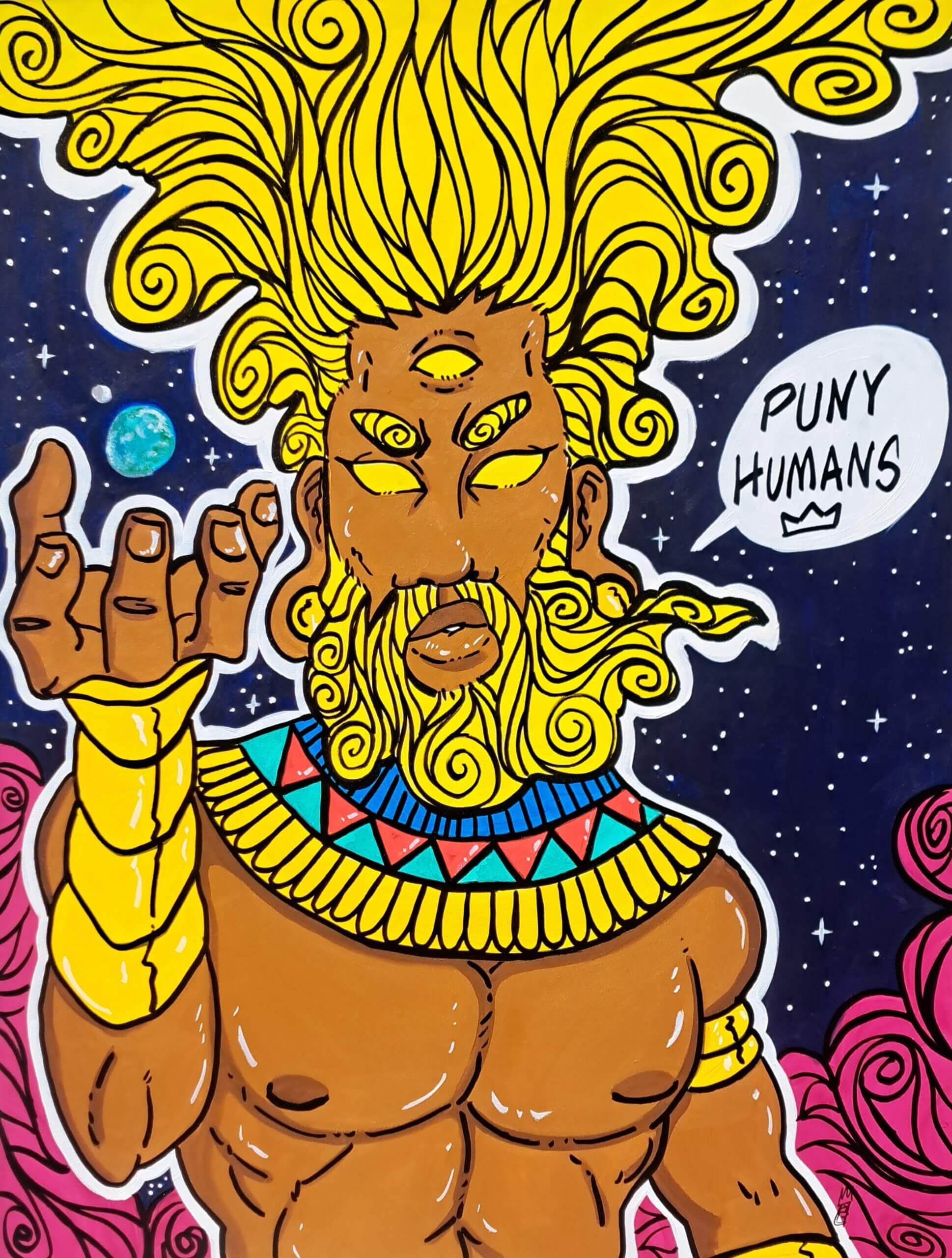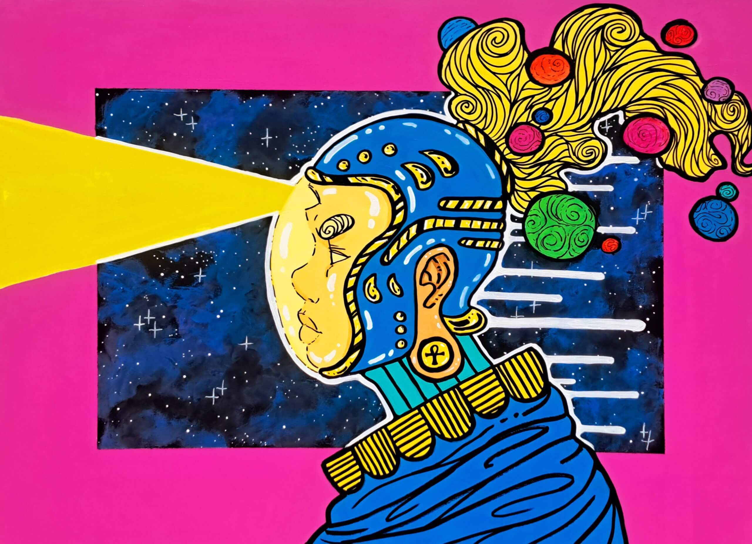 Hodge intentionally creates the counter-image of positive, purposeful and powerful Black figures in cosmic settings. “I want my work to awaken the god within every melanated person that beholds it,” he says, “and instill a state of reverence in the non-melanated viewer.”